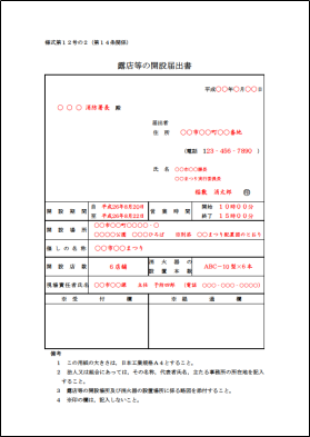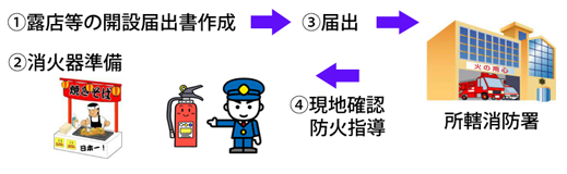 祭礼、縁日、花火大会その他の多数の者の集合する催しに際して、対象火気器具等を使用する露店等を開設する場合は、事前に管轄する消防署への届出(露店等の開設届出書)をする必要があります。
