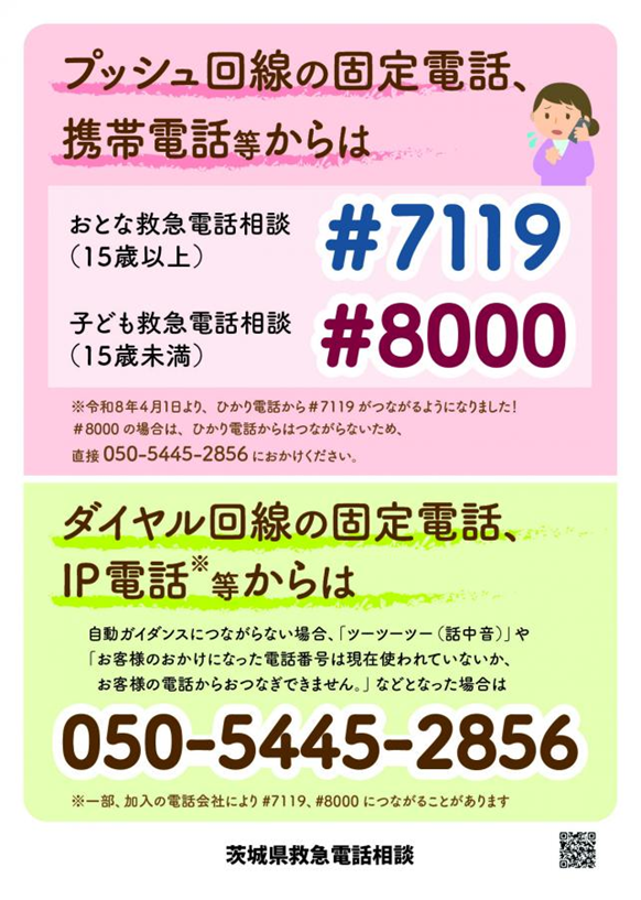 ※令和8年4月1日より、ひかり電話から#7119がつながるようになりました。#8000の場合は、ひかり電話からはつながらないため、直接050-5445-2856におかけください。