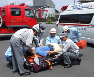 消防車にはAEDや応急処置器材を積載しかつ、消防隊員も救急隊員と同じ資格を持った隊員が乗っていますのでご安心ください。