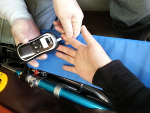 意識状態が悪くなってしまった傷病者に対して血糖値の測定を行います。低血糖が確認された場合には、医師から電話等で指示を受け、ブドウ糖溶液を点滴から投与します。