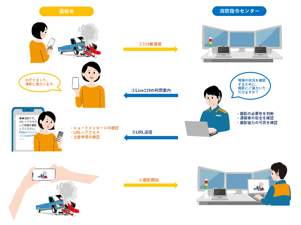 『Live119』とは、通常の音声による119番通報に加えて、現場の状況を映像で確認できるシステムです。
