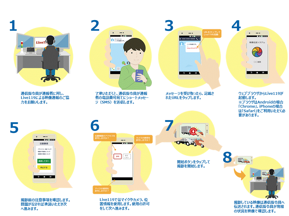 2 通報者の安全が確保されており、映像送信時に通信料金が発生することを確認します。了承いただくと、通信指令員が通報者の電話番号宛てにショートメッセージ(SMS)を送信します。