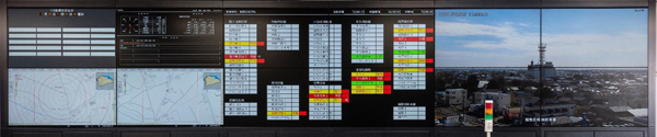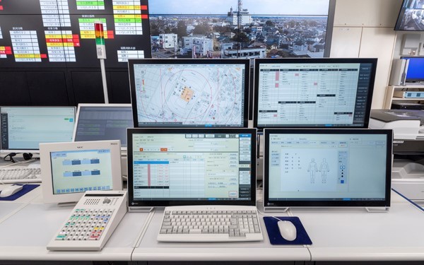 消防指令センターの前面に配置した表示盤に、車両運用状況や気象・警報注意報情報、地図情報などを表示します。消防指令センター内で情報共有を図りながら、災害状況に応じた指揮活動をはじめとした現場活動全般の支援を行います。
