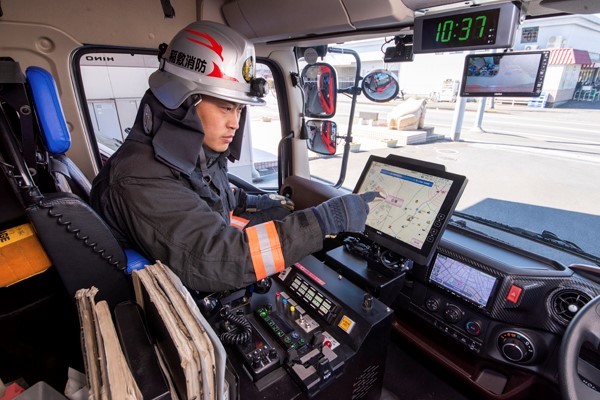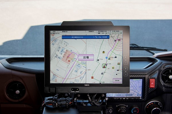 災害現場に出場する車両への指令情報や地図情報、現場までの最短ルートといった現場到着までに必要な支援情報がリアルタイムに表示されます。
