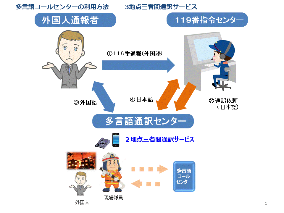 119番通報時および消防・救急の現場活動において、日本語による対応が困難な外国人等に対して、電話同時通訳コールセンターを介して三者通話または二者通話により、24時間の多言語通訳を行うことができます。