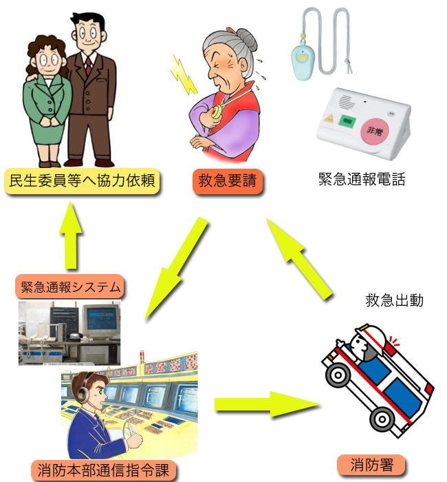 このシステムは、当広域圏内のひとり暮らしの高齢者等のお宅に取り付けられた緊急通報用電話と消防本部(通信指令課)に設けられた受信装置を結ぶもので、病気、ケガをされた時や火災をはじめとする災害等が発生した緊急時に、電話本体や無線型ペンダントの非常ボタンを押すことによって、消防本部に通報が入り、迅速かつ適切な対応が図れるシステムです。